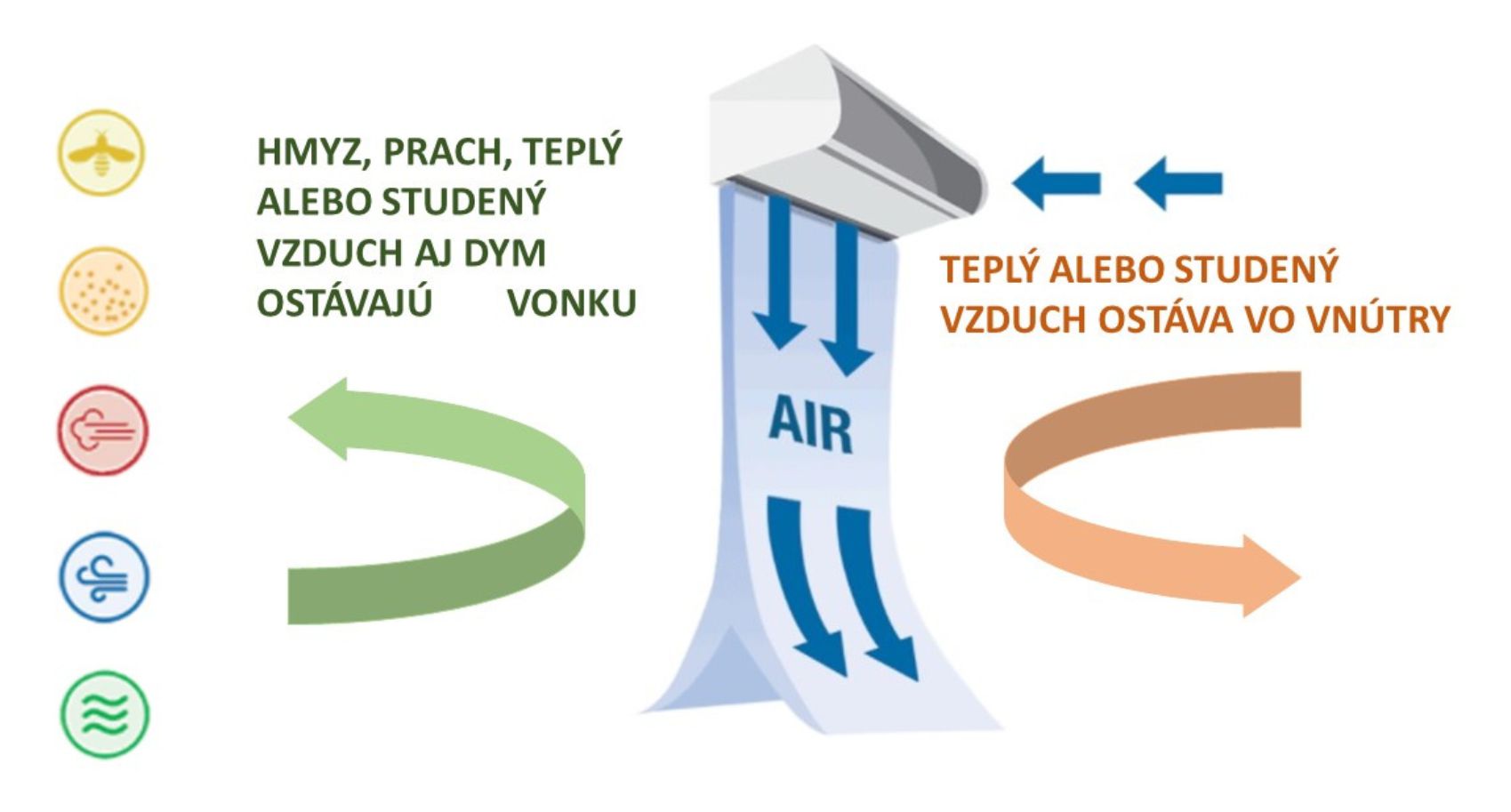 Oddeľuje tak od seba prostredie s rôznymi teplotami vzduchu a umožňuje stálu prevádzku dverí aj plnú priehľad cez ne. Výrazne tiež znižuje prenikanie prachu, pachov alebo lietajúceho hmyzu dovnútra budovy.
